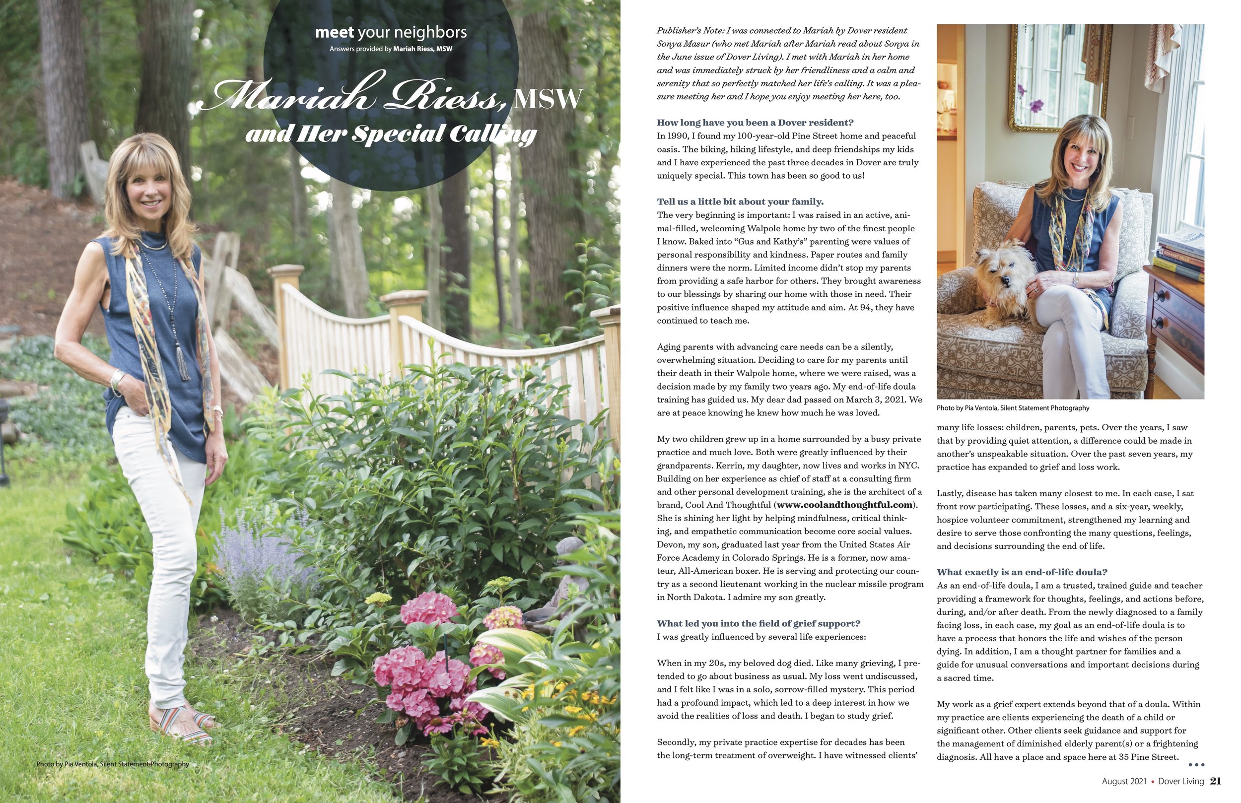 My practice has been largely built on word-of-mouth and select referrals, and so even though each case remains confidential, community has been a powerful backdrop for what I do. I have lived in Dover, Massachusetts for over thirty years, it was wonderful to welcome the team from Dover Living to share more about the work of grief and lifestyle design.